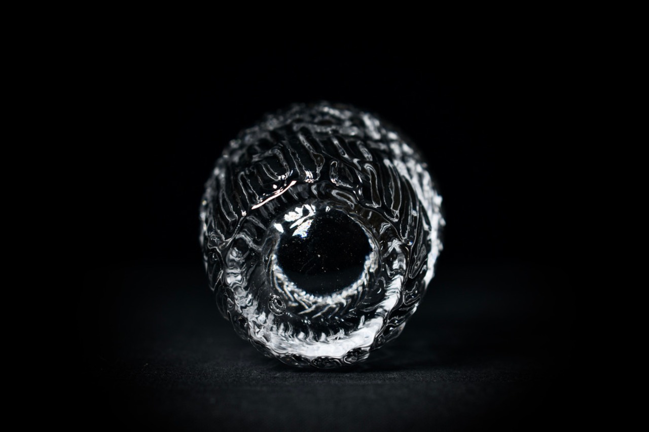 掘り出した粘土を造形して文様を施したPattern作品の型をとり、その型に向かってガラスを吹き込み、粘土表面の細かい凹凸や文様を転写したガラス作品。