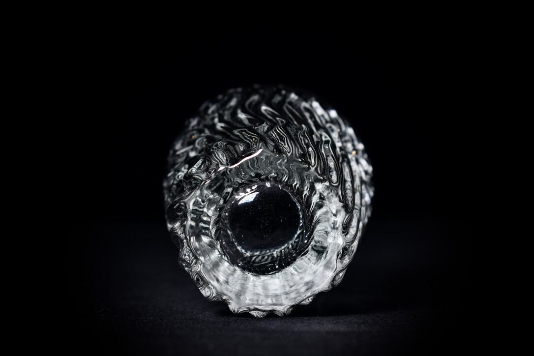 掘り出した粘土を造形して文様を施したPattern作品の型をとり、その型に向かってガラスを吹き込み、粘土表面の細かい凹凸や文様を転写したガラス作品。