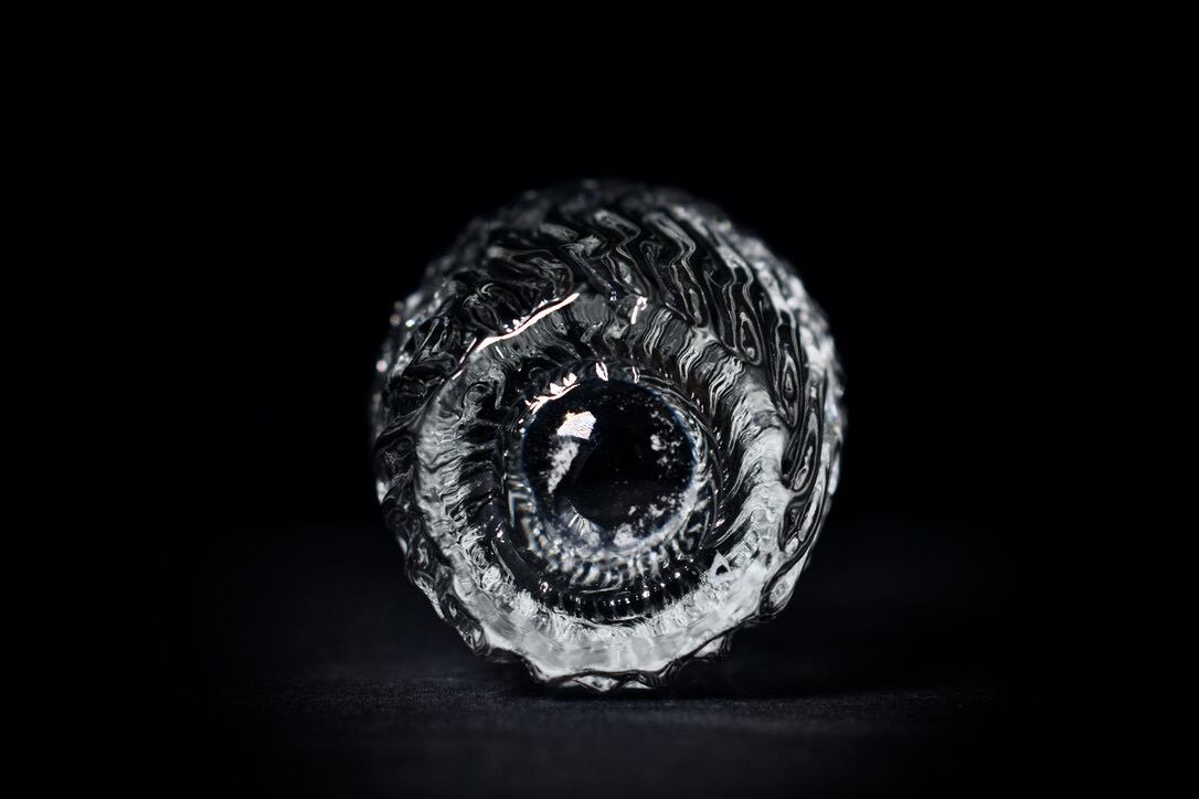掘り出した粘土を造形して文様を施したPattern作品の型をとり、その型に向かってガラスを吹き込み、粘土表面の細かい凹凸や文様を転写したガラス作品。
