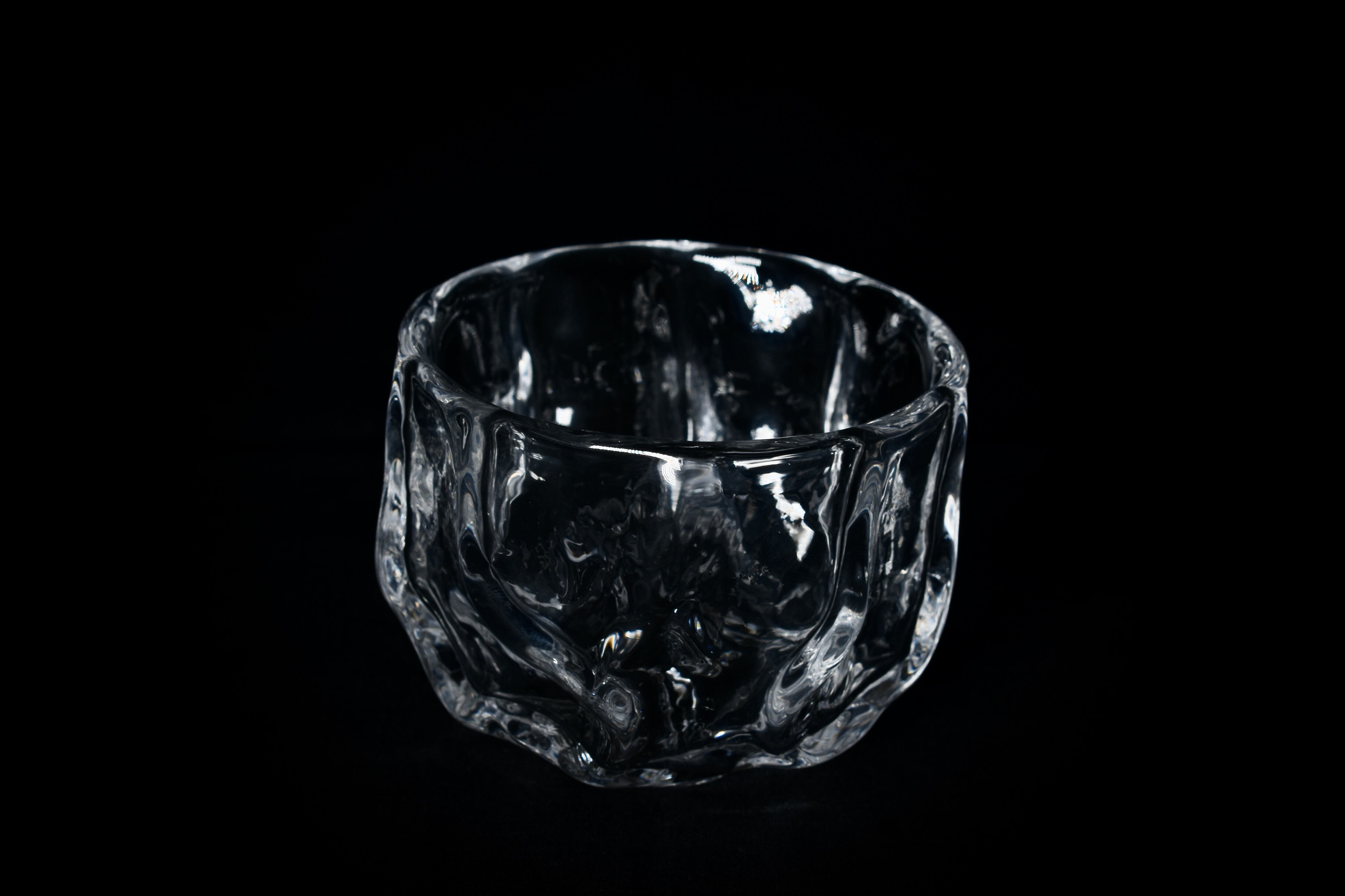 掘り出した粘土を造形して文様を施したPattern Cupの型をとり、その型に向かってガラスを吹き込み、粘土表面の細かい凹凸や文様を転写したガラス作品。