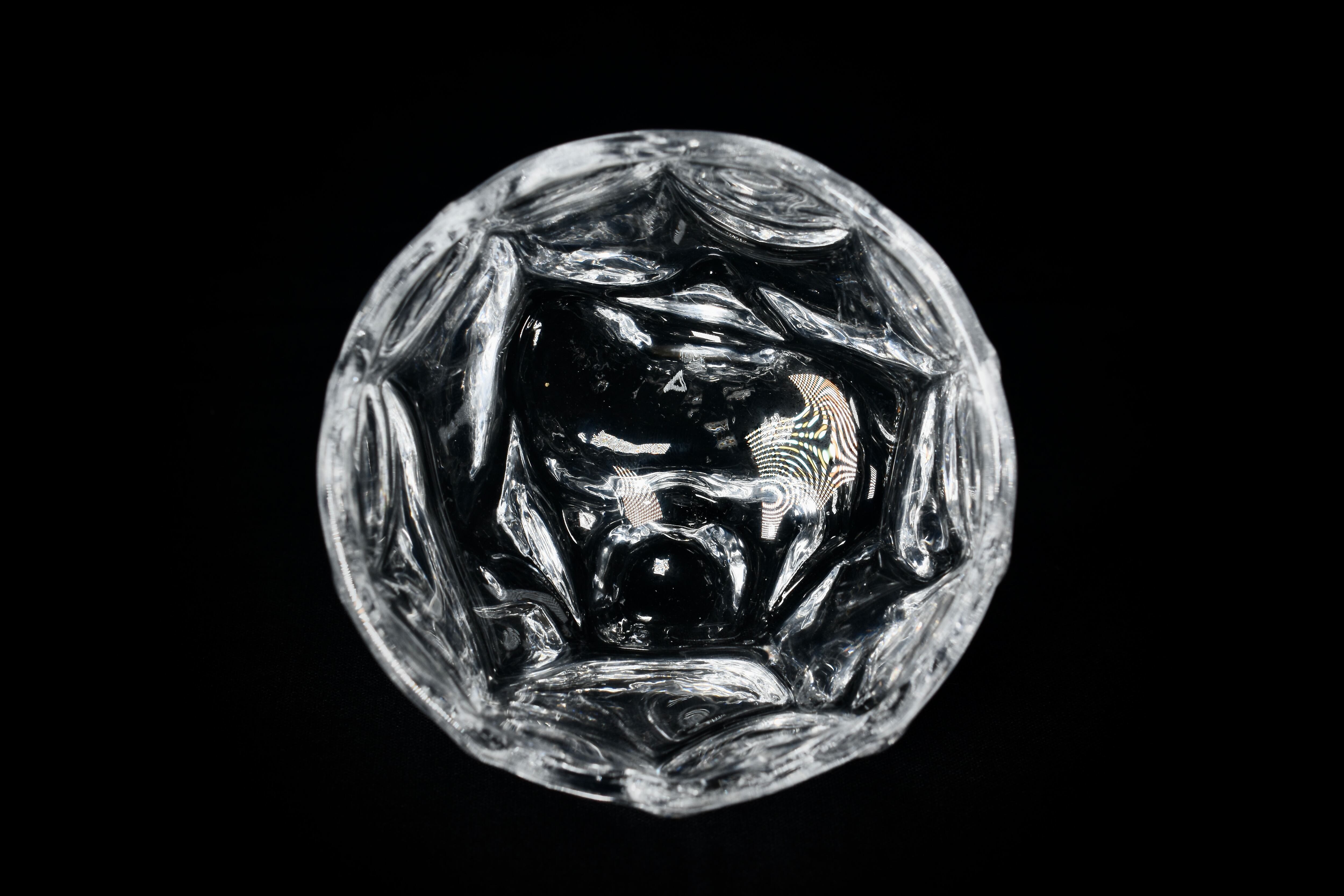 掘り出した粘土を造形して文様を施したPattern Cupの型をとり、その型に向かってガラスを吹き込み、粘土表面の細かい凹凸や文様を転写したガラス作品。