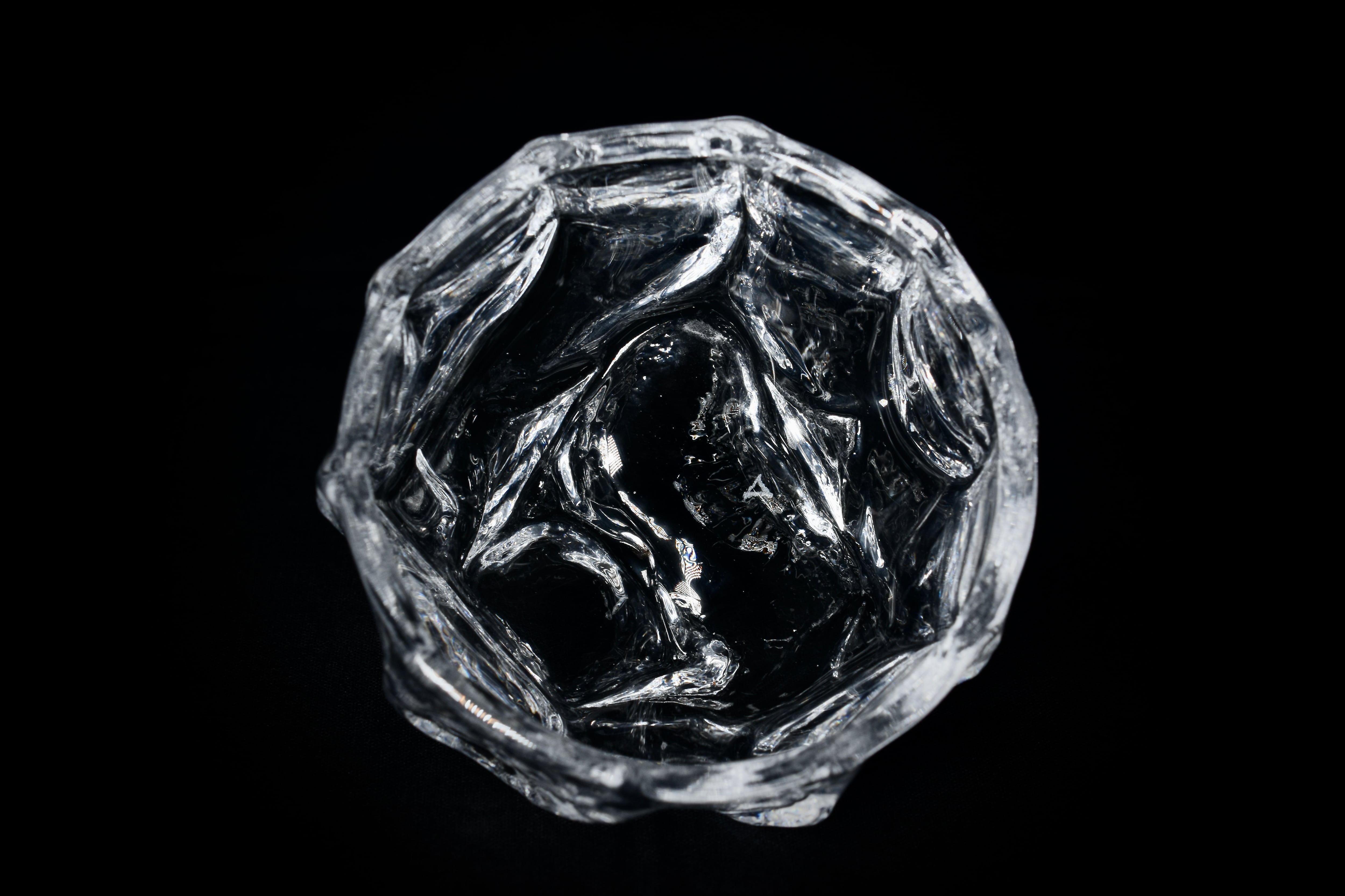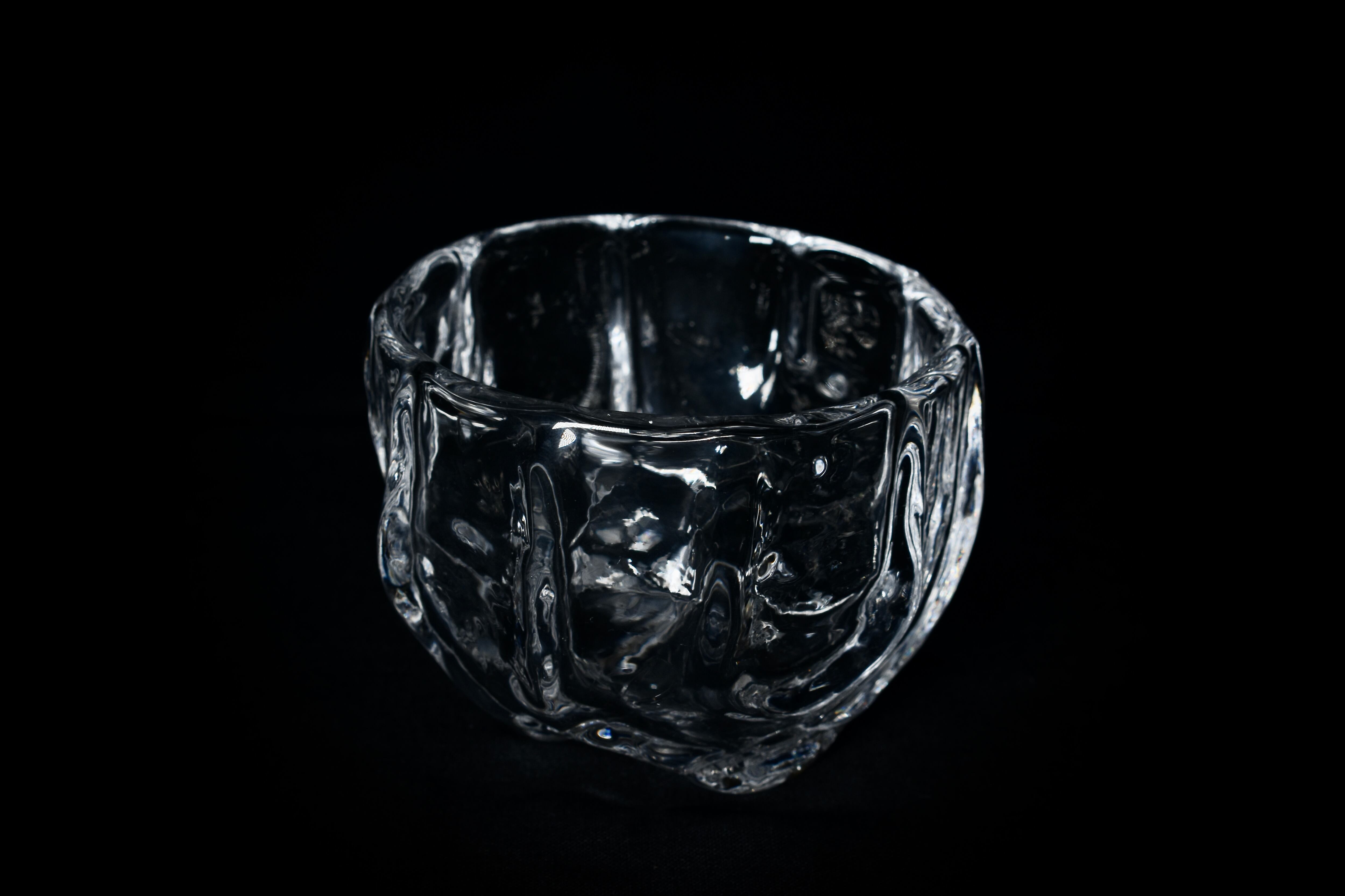 掘り出した粘土を造形して文様を施したPattern Cupの型をとり、その型に向かってガラスを吹き込み、粘土表面の細かい凹凸や文様を転写したガラス作品。