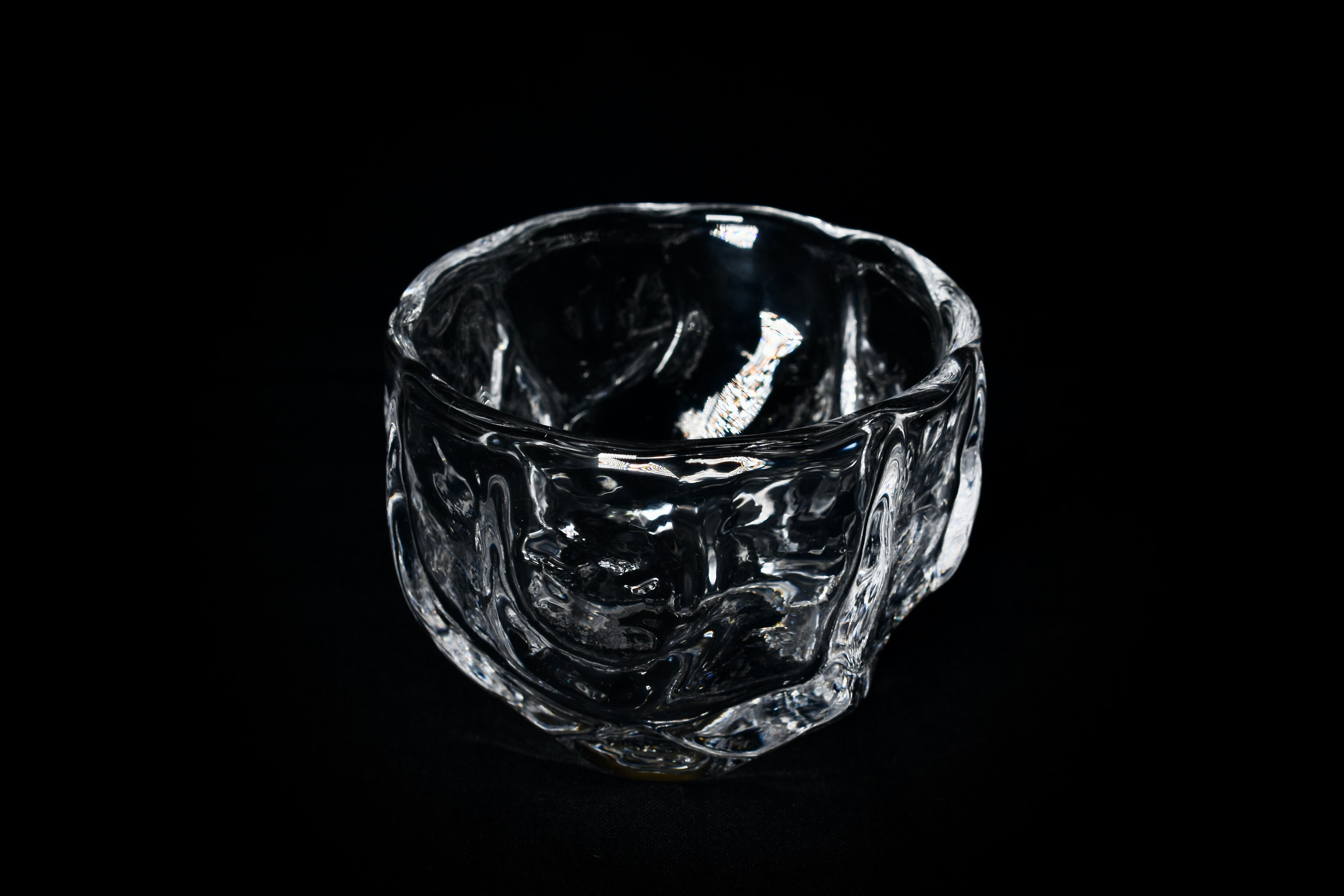 掘り出した粘土を造形して文様を施したPattern Cupの型をとり、その型に向かってガラスを吹き込み、粘土表面の細かい凹凸や文様を転写したガラス作品。