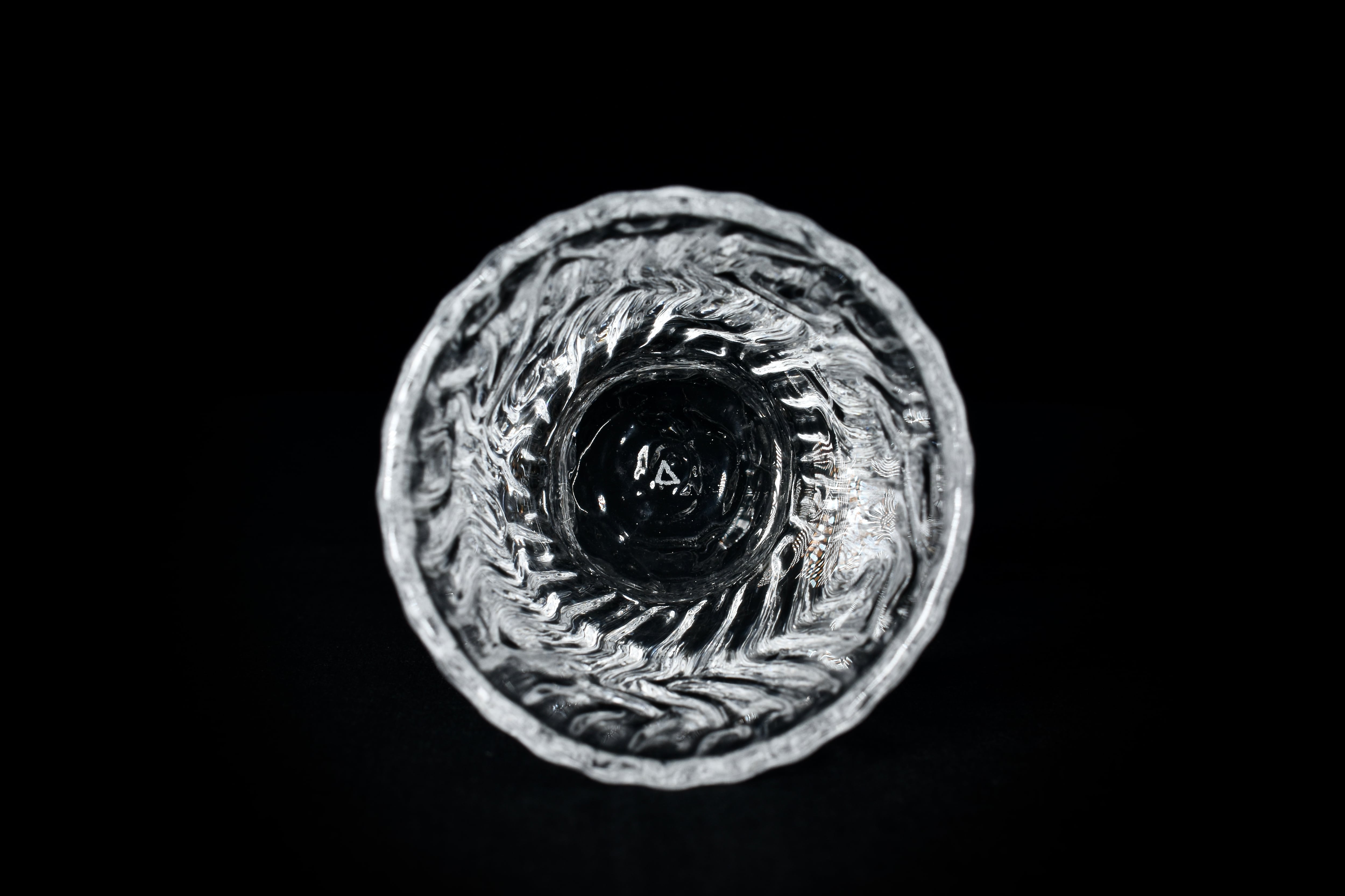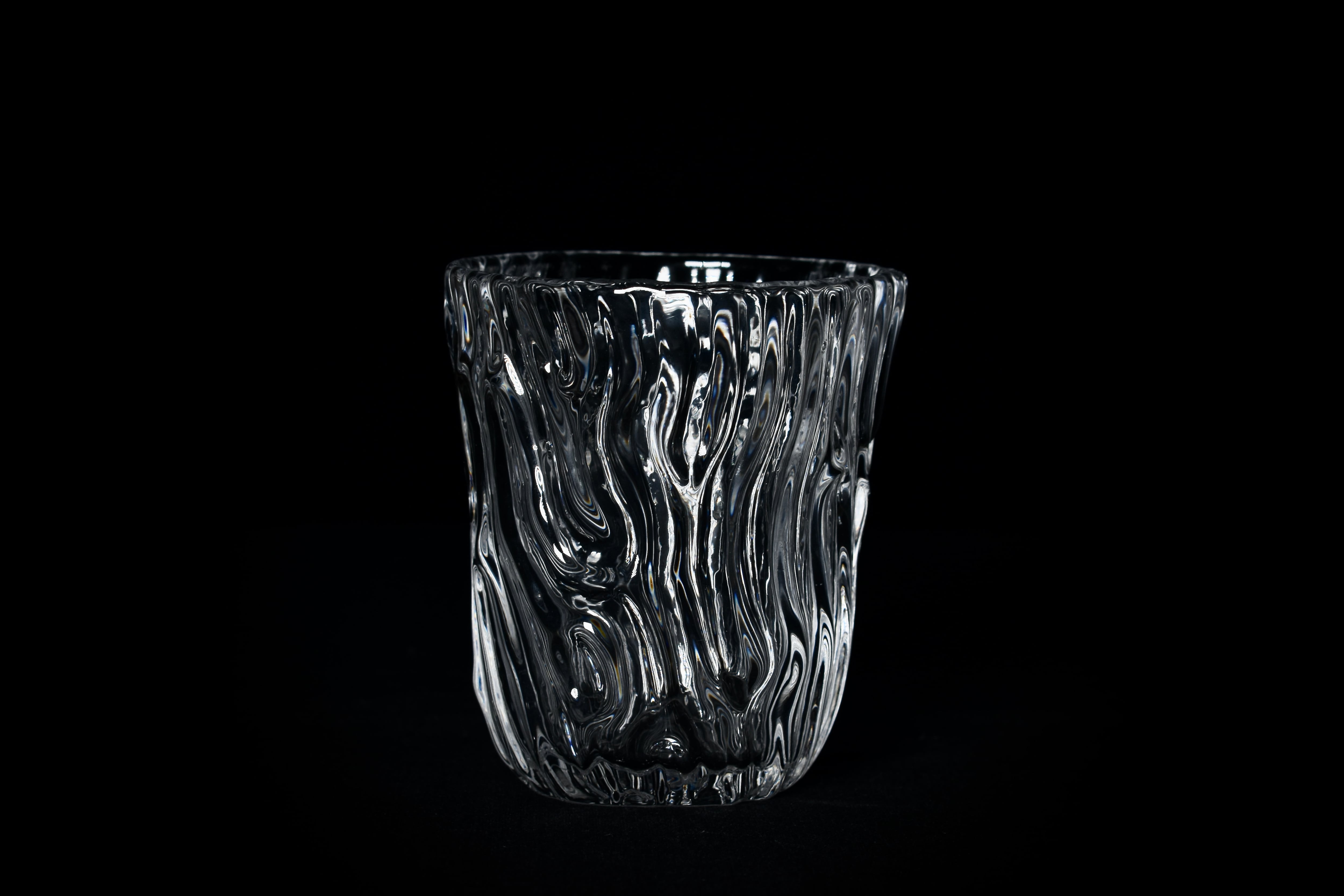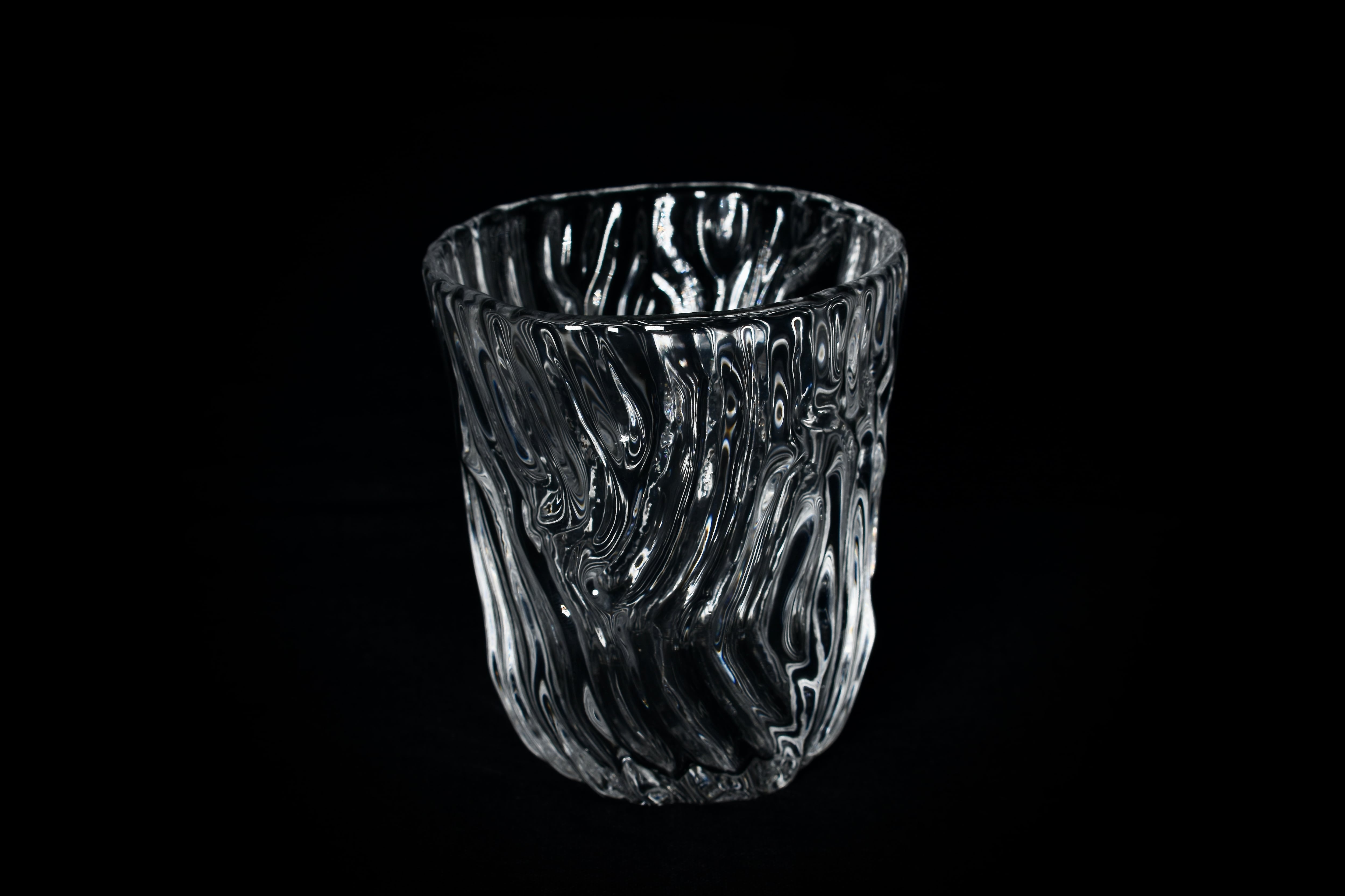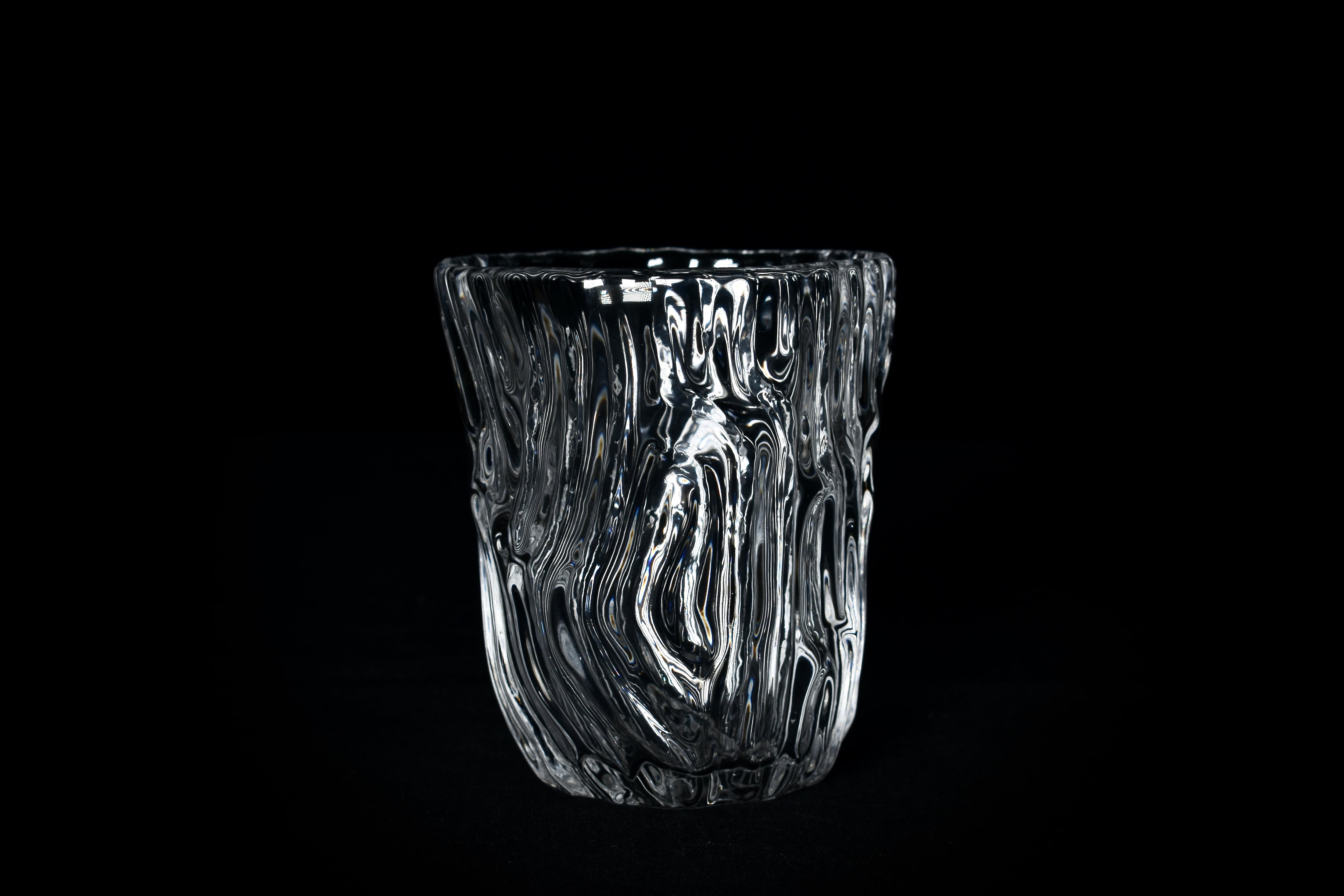 掘り出した粘土を造形して文様を施したPattern作品の型をとり、その型に向かってガラスを吹き込み、粘土表面の細かい凹凸や文様を転写したガラス作品。