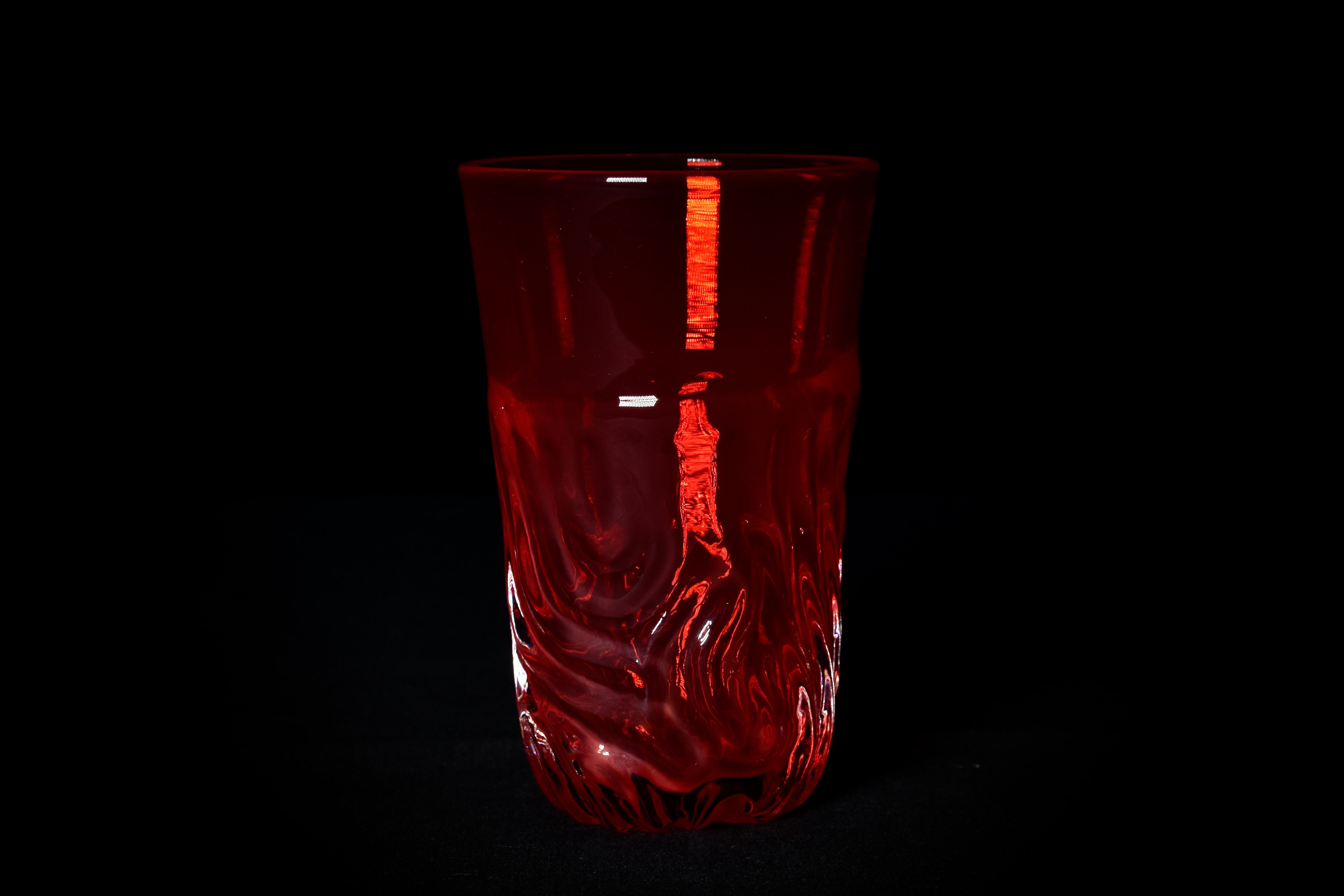 また、文様部分は透明なガラスを用いていますが、それ以外の部分は赤いガラス素材を使用しています。そのため見る角度や光の透過によって、赤さと透明さが面白く混ざり合って変化します。