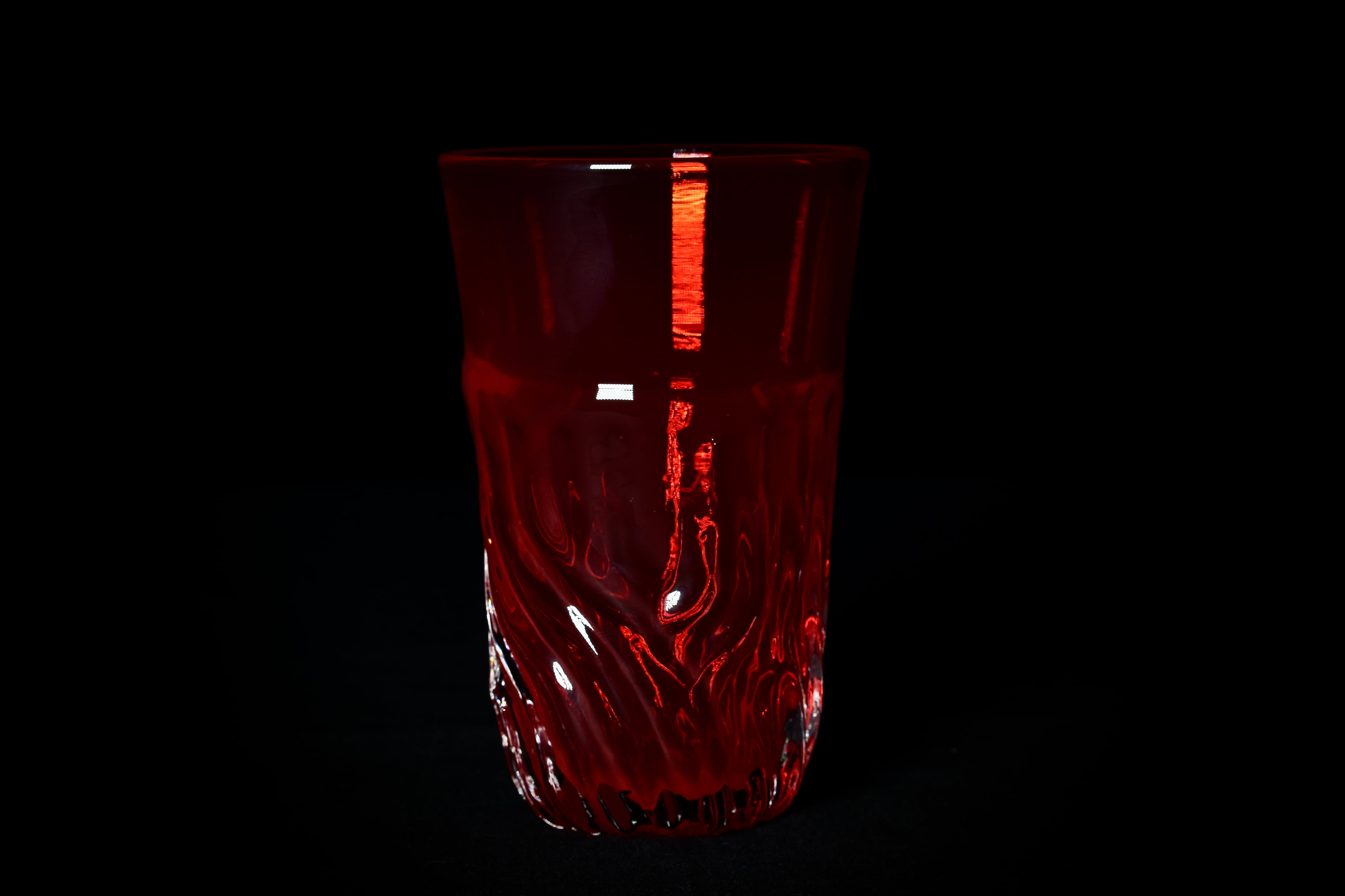 文様部分はこれまで制作したガラス作品よりも分厚くむっちりとした作りになっており、そこから連続して飲み口が薄く立ち上がった造形になっています。