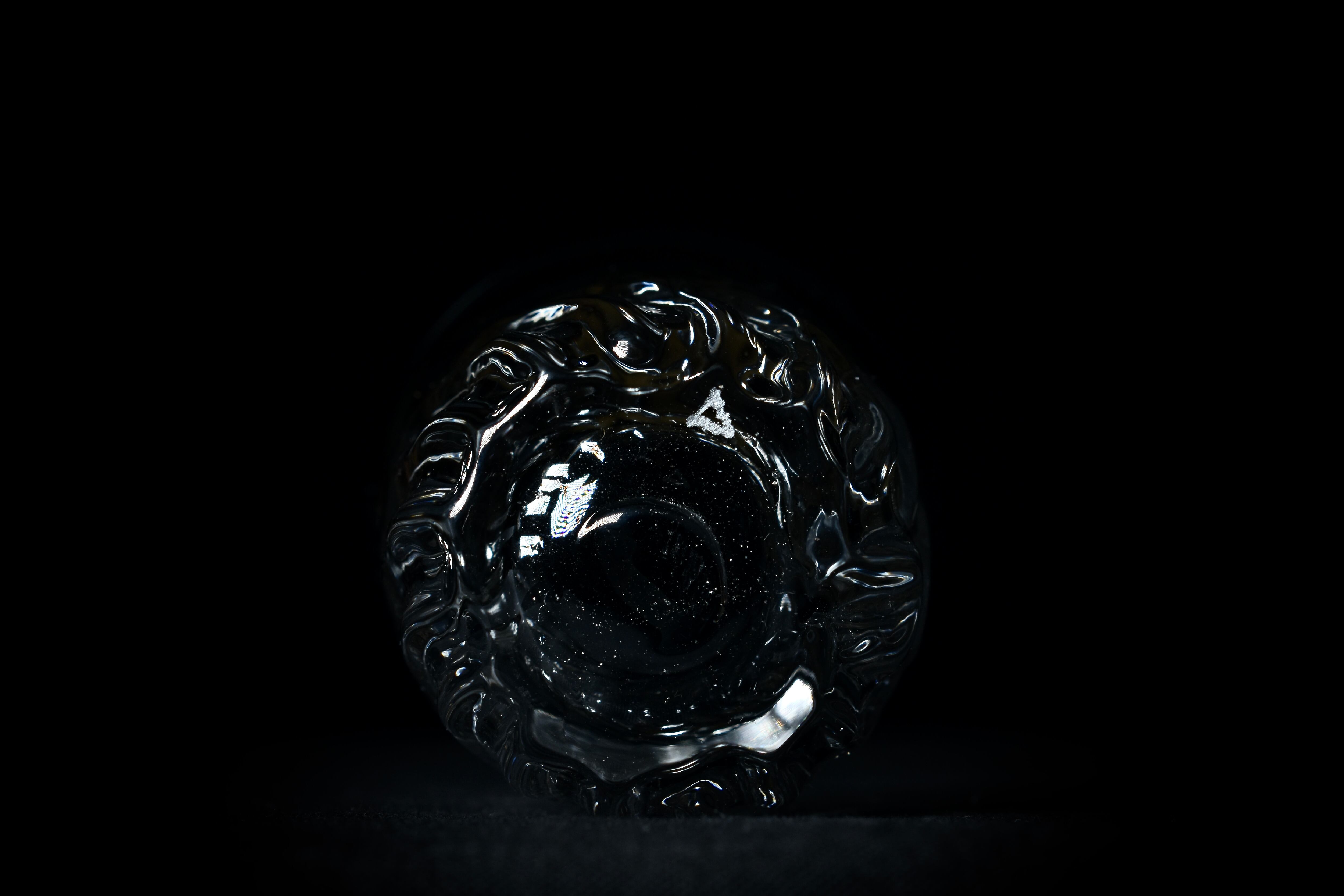 文様部分はこれまで制作したガラス作品よりも分厚くむっちりとした作りになっており、そこから連続して飲み口が薄く立ち上がった造形になっています。