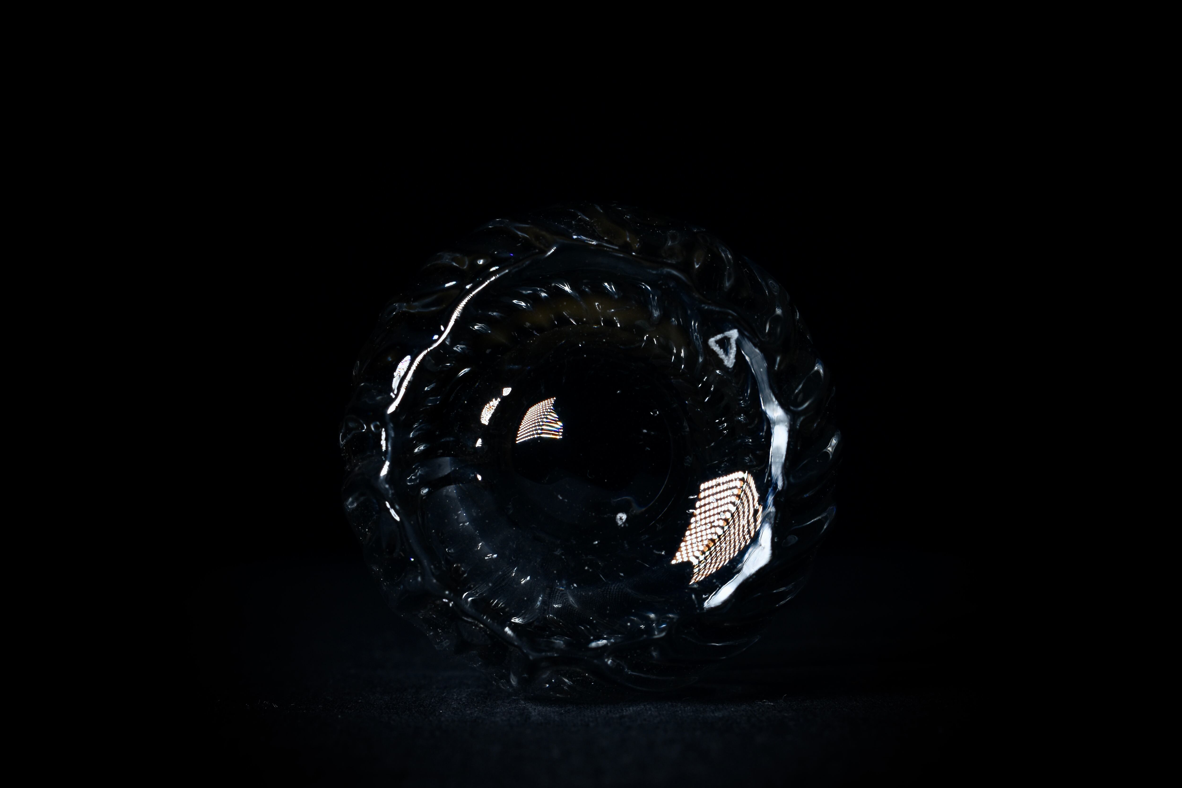 文様部分はこれまで制作したガラス作品よりも分厚くむっちりとした作りになっており、そこから連続して飲み口が薄く立ち上がった造形になっています。