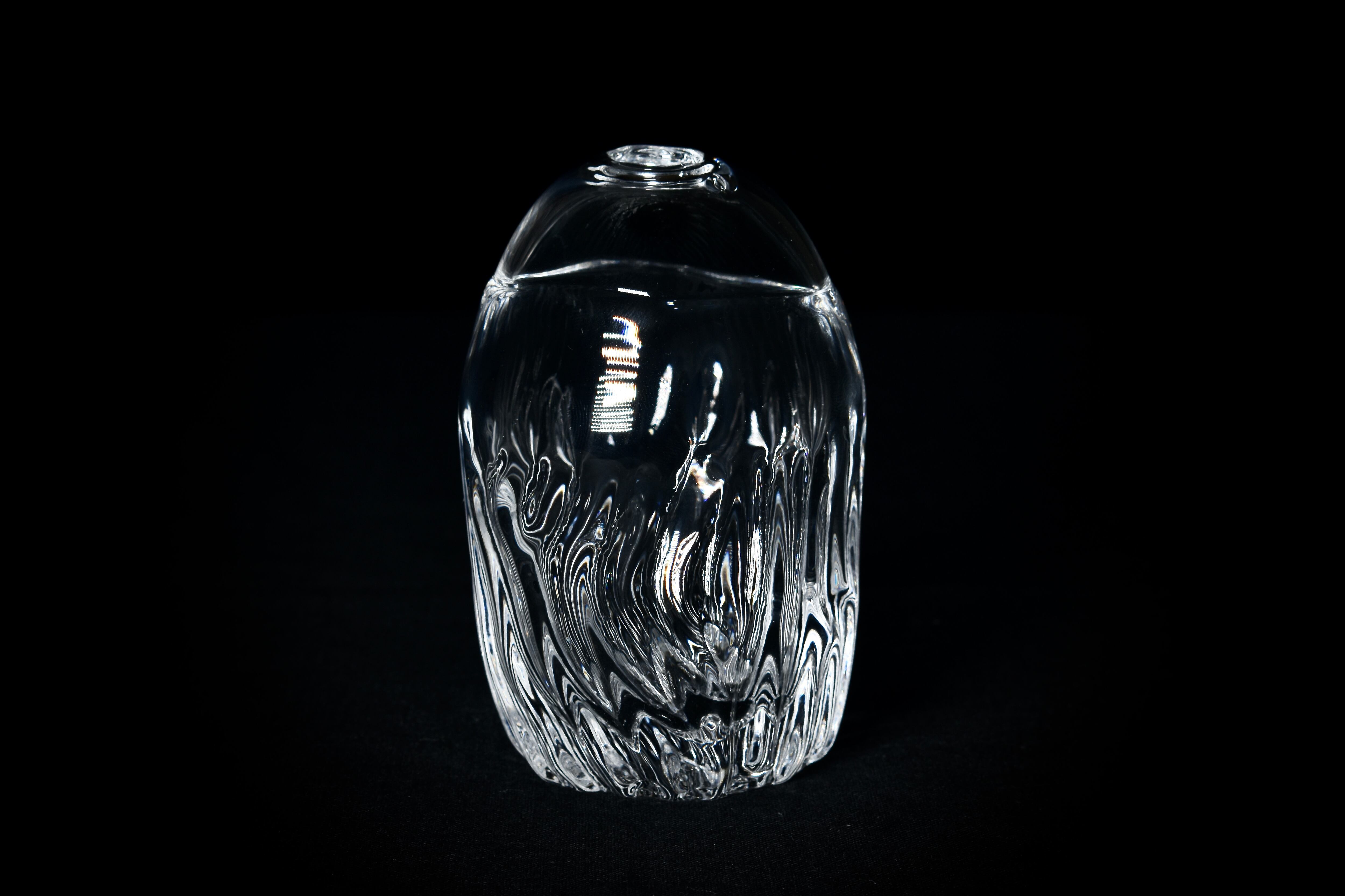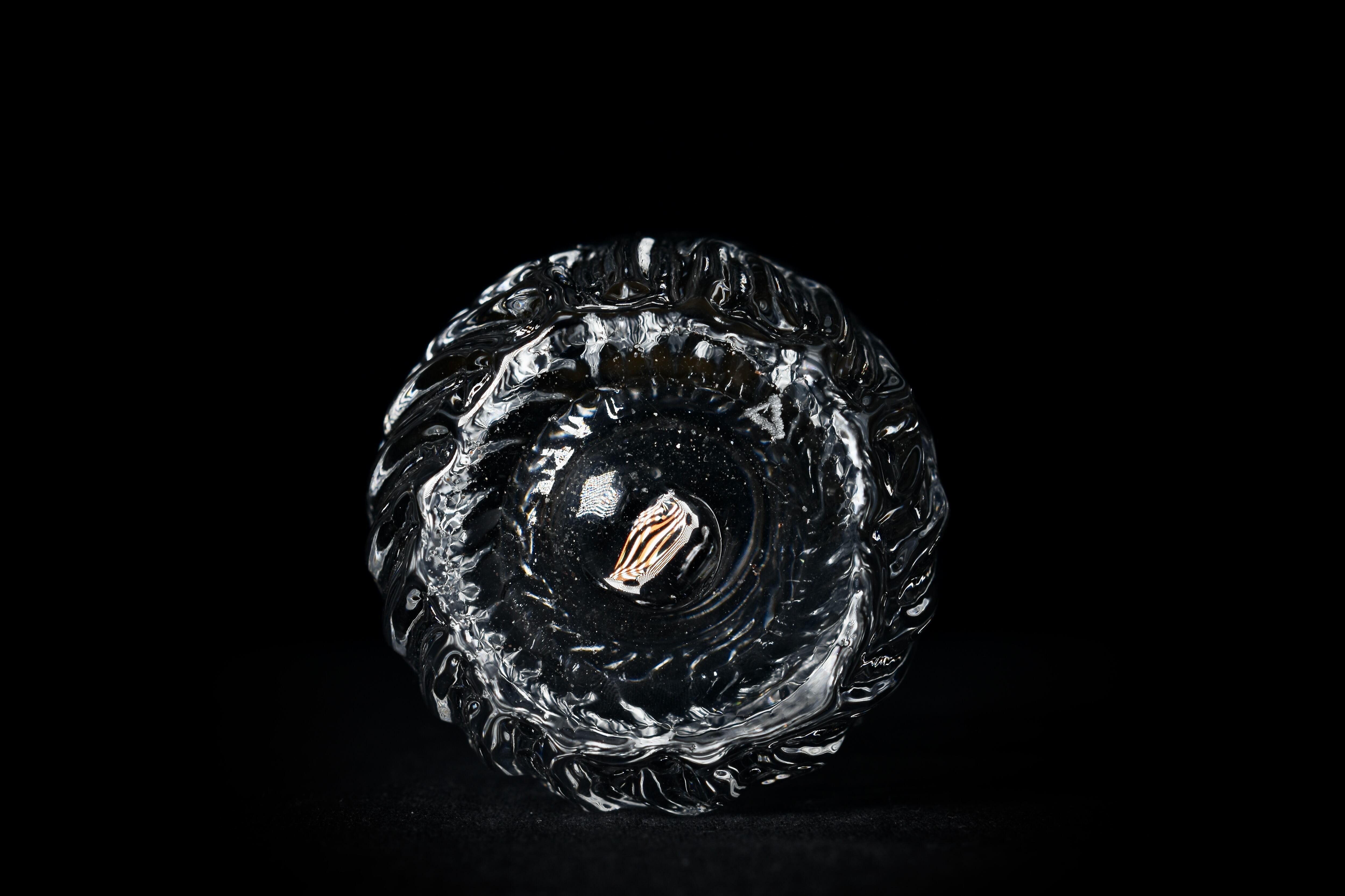 文様部分はこれまで制作したガラス作品よりも分厚くむっちりとした作りになっており、そこから連続して薄く立ち上がった、一輪挿しの造形になっています。