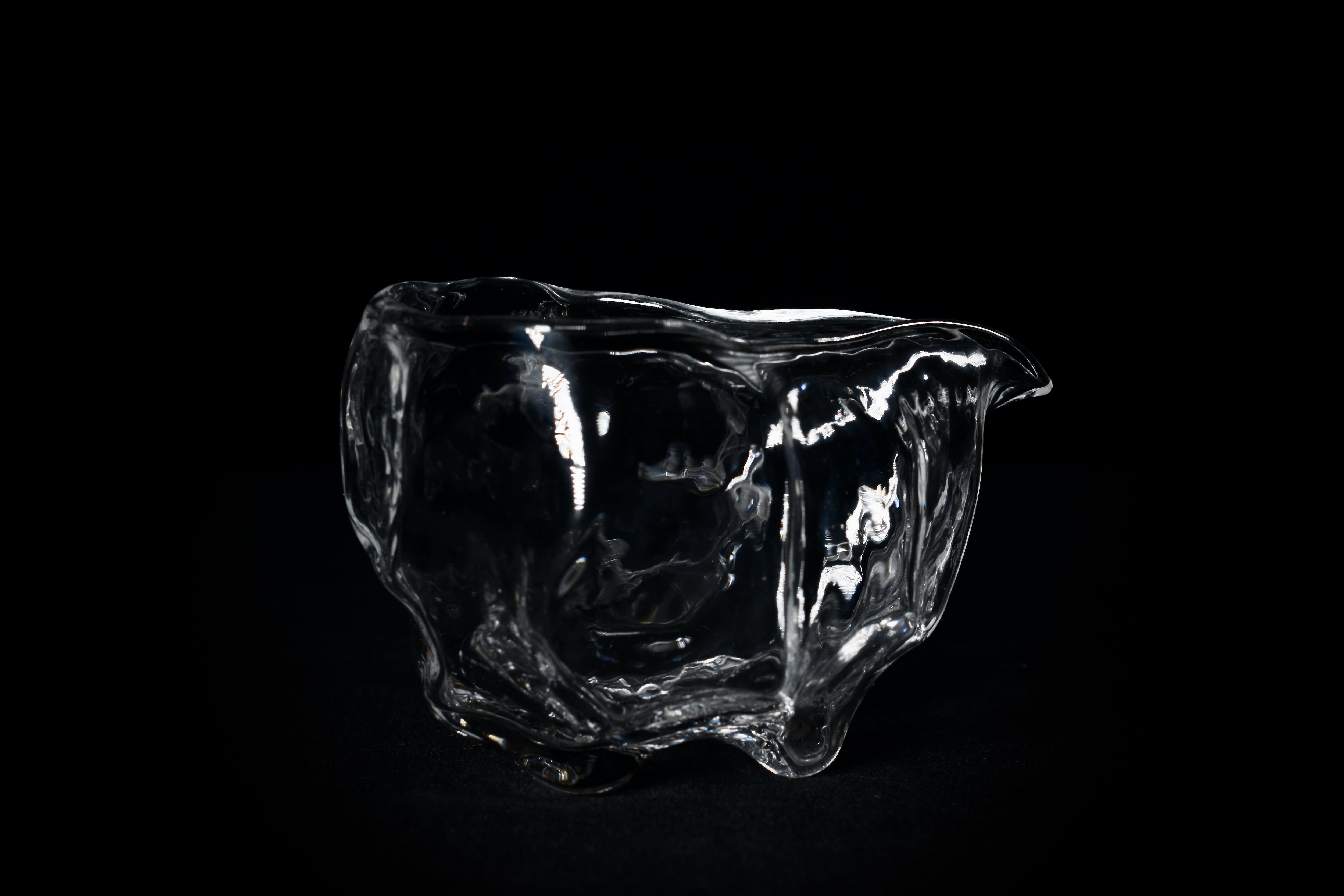掘り出した粘土を造形して文様を施したPattern Cupの型をとり、その型に向かってガラスを吹き込み、粘土表面の細かい凹凸や文様を転写したガラス作品。