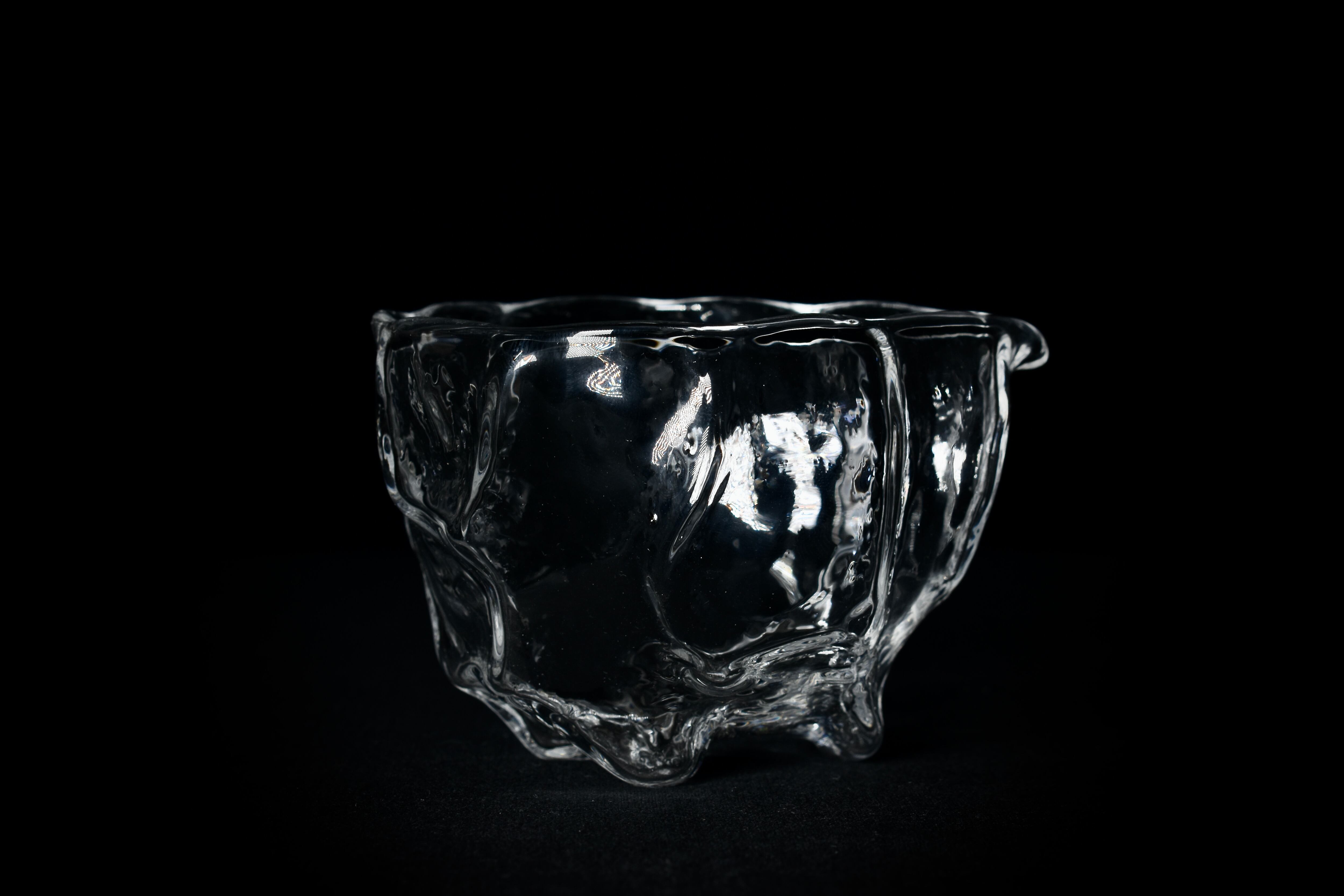 掘り出した粘土を造形して文様を施したPattern Cupの型をとり、その型に向かってガラスを吹き込み、粘土表面の細かい凹凸や文様を転写したガラス作品。